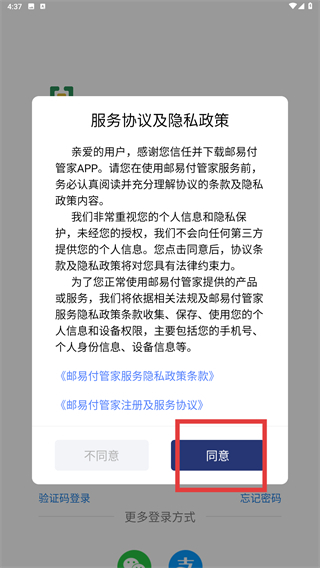 1、仔细阅读《服务协议及隐私政策》,确认无误后点击【同意】按钮,即可进入登录页面。
