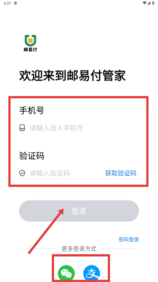 3、也可以选择验证码登录的方式:先输入法人的手机号,接着获取并填写验证码,之后点击【登录】按钮即可;另外,还能通过微信、支付宝等第三方平台进行登录。