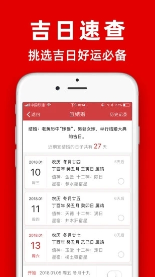 1. 黄历查询:可查询每日黄历详情,涵盖宜忌事项、冲煞信息、胎神方位以及时辰吉凶等内容。