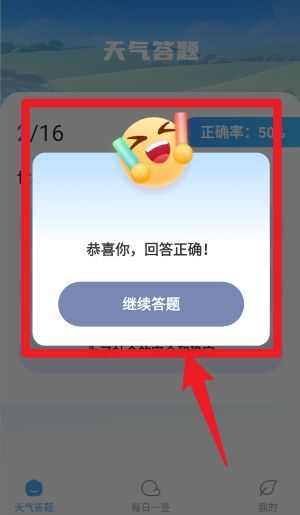 2、当答题正确后,会弹出提示窗口,点击“继续答题”按钮就能进入下一题,这种寓教于乐的形式能让气象知识的学习过程变得更轻松、更有趣。