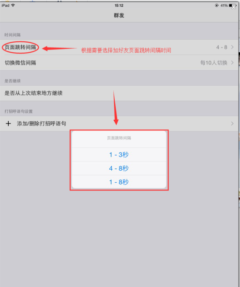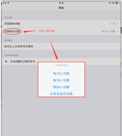 6、调整微信切换的时间间隔,依据你登录的微信号数量,来选择按顺序分批发送消息。