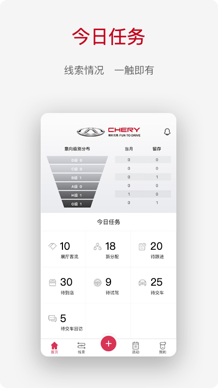 奇瑞CRM是一款专注于汽车销售领域的数字化办公管理软件,助力用户随时捕捉潜在商机。它针对不同岗位配置了专属功能模块,不仅能帮助挖掘高质量客户资源,还能显著提升管理效率与签单转化率。软件支持多身份登录,实现销售全流程自动化管理,让各岗位人员都能高效统筹负责板块,大幅优化工作效能。欢迎各位用户体验奇瑞CRM!