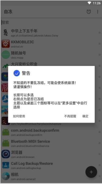 1.打开软件后会弹出提示,要注意不能随意冻结,不然会造成手机崩溃