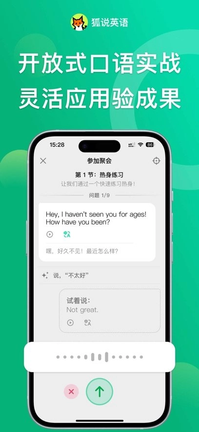 1、提供了多种学习模式,从最简单的中文输入跟读翻译,到完全抛开中文的流利口语对话,适合不同水平的用户。
