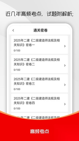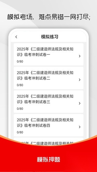 1、海量真题与模拟题资源:全面收录历年二级建造师考试真题,覆盖所有科目及各年份试题,助力考生熟悉真实考试的题型特点、难度水平与出题规律。