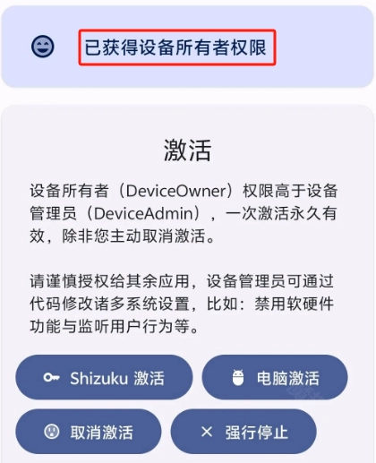 通过Dhizuku的简便与安装,您可轻松设定设备所有者,共享设备权限,并将这些权限授权给其他应用程序。一旦激活,成功授权将永久有效,使得设备管理员的权限共享变得更加轻松便捷。