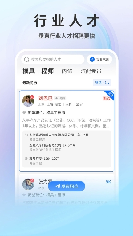 软件拥有庞大的汽车行业相关职位信息库,覆盖各类岗位,用户能依据自身职业需求与发展方向,便捷筛选出理想职位。平台实时更新职位推荐,助力求职者及时掌握最新招聘动态。借助简洁直观的操作界面,用户可快速完成简历投递与面试预约,让求职过程更便捷、高效。