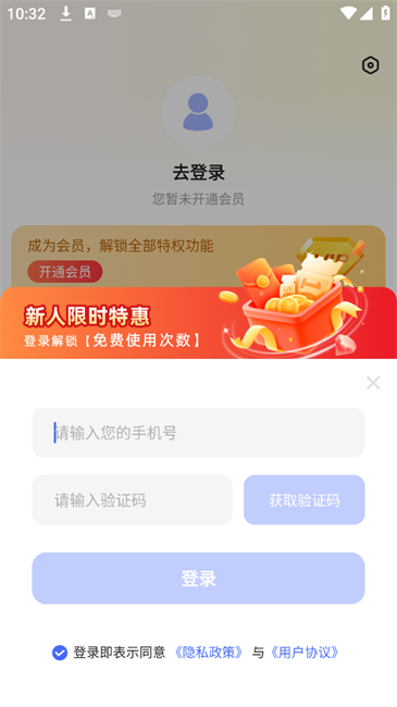 2. 输入手机号码以获取验证码,勾选相关协议后,点击“登录”按钮。