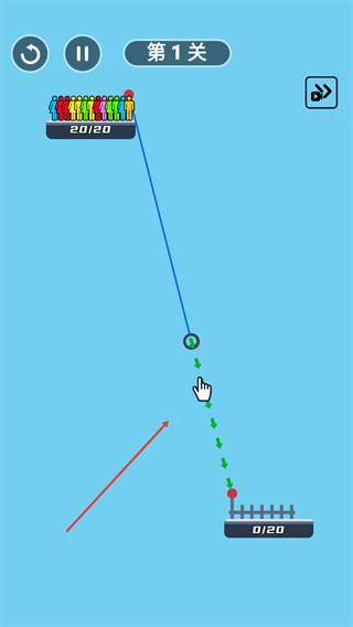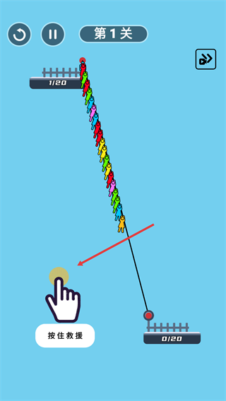 2、进入【第1关】,按照指引操作绳索,连接初始显示为【20/20】的人群,以此开启救援关卡的操作流程。