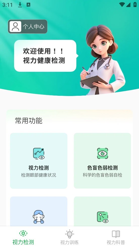 2、进入首页后,能看到各类丰富的功能选项,找到【视力检测】并点击即可进入。
