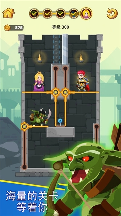 《英雄救援》是一款十分有趣的休闲益智闯关游戏,游戏内设计了丰富多样的关卡。玩家的目标是解救被困的公主,只有成功击败所有怪物,才能顺利闯过关卡。感兴趣的朋友,快进入《英雄救援》开启游戏挑战吧!