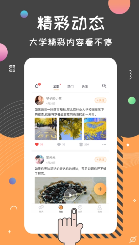 3.动态分享与互动功能:支持图文、视频等多样化内容形式的分享,用户能够便捷地记录校园生活点滴,还可以和好友进行点赞、评论等互动,从而加深彼此之间的了解。