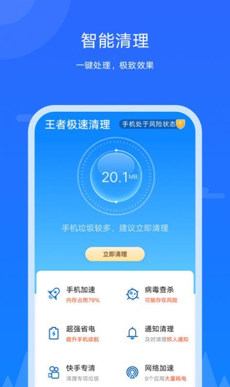 王者极速清理是一款智能管理手机后台应用的清理软件,它能有效延长电量续航时间,避免手机机身过热;同时可快速清理垃圾文件,释放手机内存空间,让手机运行更加流畅。此外,该软件还具备优化手机性能、辅助降温处理的功能。