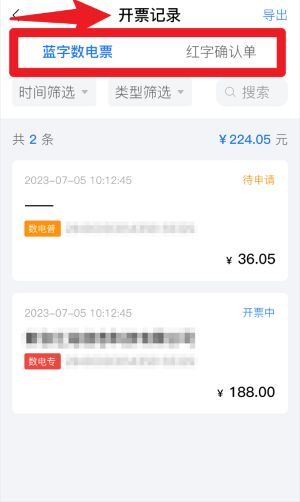 5、点击开票记录,即可查询所有已开具的蓝字或红字发票,系统支持按时间、类型进行筛选,方便查看历史发票明细。