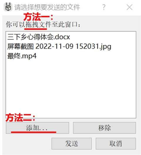 1、首先在电脑端把要发送的文件拖入窗口,或者点击左下角的“添加”按钮,之后点击“发送”即可。