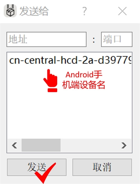 2、当两台设备的软件都处于打开状态时,电脑端会显示如下界面。此时选择需要传送的设备名称,再点击发送按钮即可。