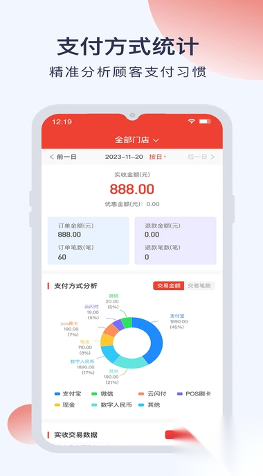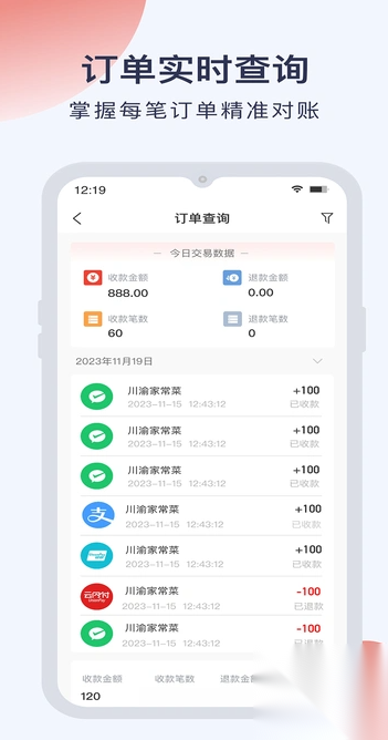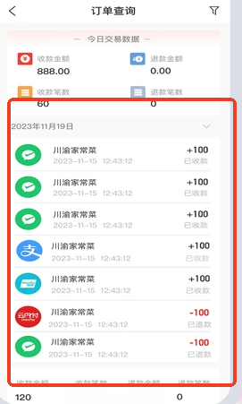 3、收款金额、退款金额、收款时间等各类数据清晰明了,直观呈现。