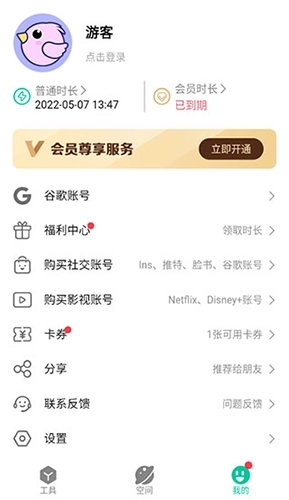 答:【会员线路】的时长可通过开通会员或邀请好友来获取,【普通线路】的时长则可通过观看视频来获取