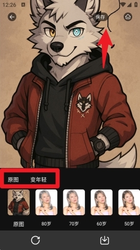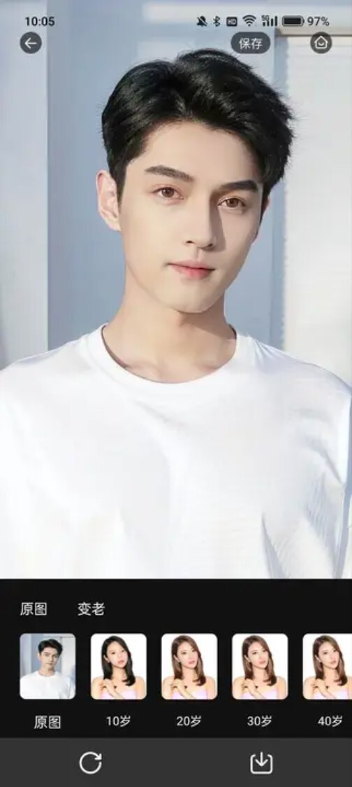 3. 进入变年轻功能区后,上传图像就能切换成不同年龄段的样貌,涵盖从80岁到20岁等多种变化效果,支持预览和保存。