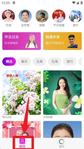 1. 启动App后进入首页,点击底部的趣图标签页,即可查看包含花海在内的各类模板分类,选择任意模块点击就能进入制作界面。