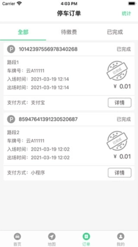 4、点击“订单”选项,即可查看截至目前的所有订单记录,用户还能按照待缴费和已完成这两个分类来筛选查找。