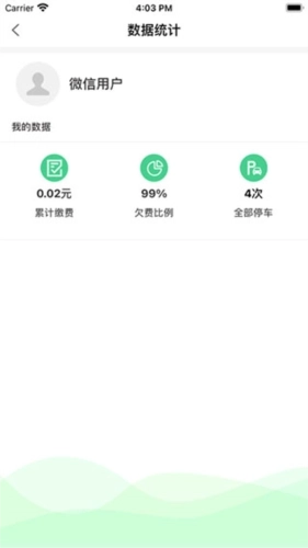 6、用户还能够查询个人的数据统计,其中包含了累计缴费金额、欠费比例以及所有停车次数的统计信息。
