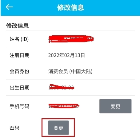 3、在修改信息页面中的密码一栏中,点击变更按钮;