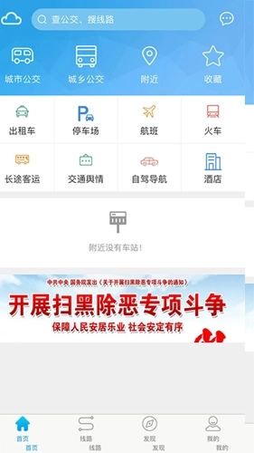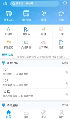 湘潭交通仅能查询湘潭市的公交详情,首页就会显示附近的公交信息,若要查找具体的公交路线,点击上方的搜索框即可。