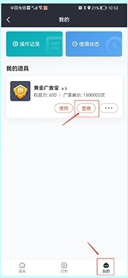3、进入道具工厂的“我的”页面后,在广告宝板块点击“置换”按钮