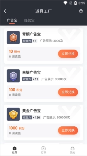 2、在打开的道具工厂页面中把积分兑换为对应广告宝