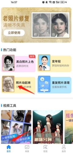 1、启动软件后,先点击“首页”选项,接着再点击“照片动起来”选项。