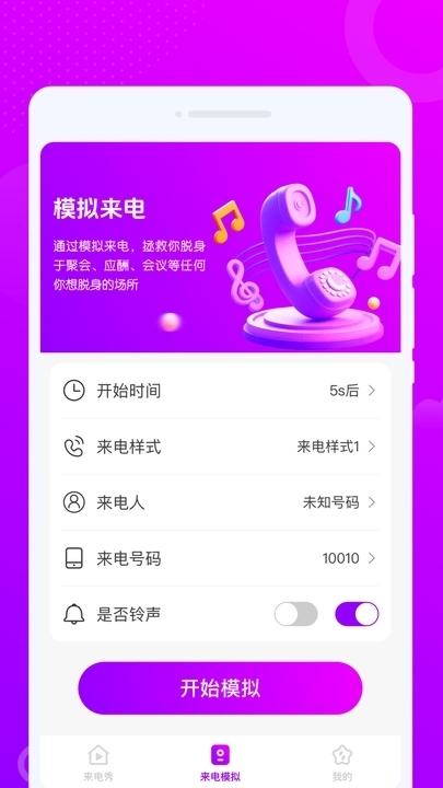 2、进入来电模拟页面后,依次选定开始时间、来电样式、来电人、来电号码,设置是否开启铃声,最后点击开始模拟按钮即可。