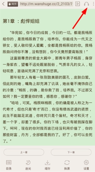 2、在阅读页面点击屏幕中央,页面顶部右上角就会出现听书按钮(即下图红色箭头所指的按钮)