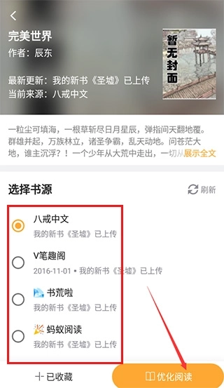 2、找到自己喜欢的小说后,既可以选择书源,也能点击优化阅读功能。