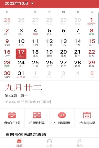1、专为中国人设计的日历工具,涵盖农历查询、黄历查看、每日宜忌查询、实时天气显示、节气介绍以及生日提醒等实用功能。