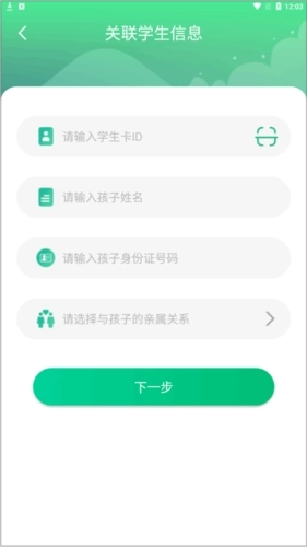2、家长需输入学生卡ID、姓名、身份证号以及亲属关系信息。