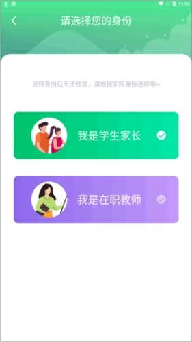 1、先把智安校园安装好,打开软件后,根据自身情况选择对应的身份——家长或者老师。