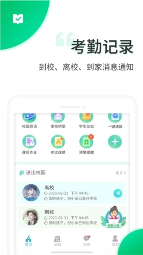 系统会自动记录孩子到校和离校的时间,孩子是否迟到、早退能清晰直观地看到。