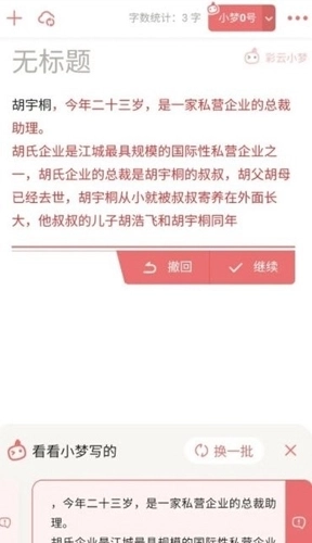 输入一段文字后,点击【AI小梦来帮写】按钮,不到一分钟小梦就会迅速给出三条不同的故事发展方向。选中其中一条后,你可以修改续写的内容,再点击继续按钮就能进行下一次续写。要是对这三条故事走向都不太满意,还可以点击换一批,让小梦重新生成新的续写内容。