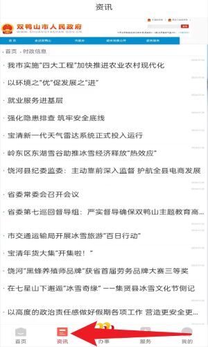 4、点击底部导航栏的“资讯”选项,即可查看双鸭山市人民政府发布的各类政策动态和最新新闻,从而实时了解政务信息。