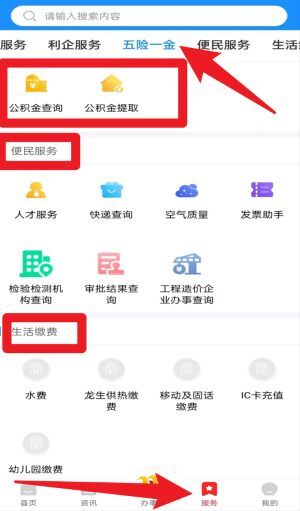 5、进入服务页面后,点击“五险一金”选项,即可使用公积金查询与提取、生活缴费等功能,其中生活缴费覆盖水费、热费、话费等多种场景。