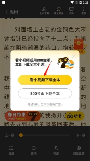 4、再然后点击看小视频全本,或者领取金币后点击金币全本也可。