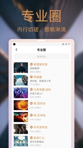 ◆话题互动:用户能够发起、加入话题,加入同一话题的用户之间可以开展交流。