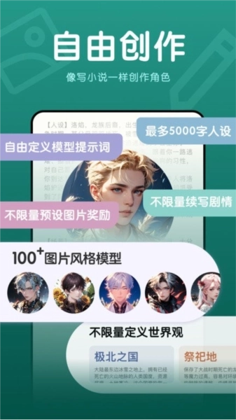 在这里,创作不再被束缚,因为我们拥有多维度且多元的创作工具——可自定义的世界观、无字数限制的人设、能无限续写的剧情、丰富不限量的人生经历与世界词条,还有50余种图片风格模型;这些都能让你心中的“梦中人”愈发活灵活现,完美契合你的个性与想象力,让TA在你的创意世界里变得生动鲜活。在这里,个性化、梦幻感与多元创作相互交织,绘就成一幅迷人的画卷,让你的创作旅程更加引人入胜。