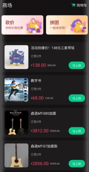2.点击底部导航栏的「商城」选项,即可进入商品页面。该页面提供琴弦、教材、配件等商品的购买服务,部分商品还支持砍价或拼团活动。