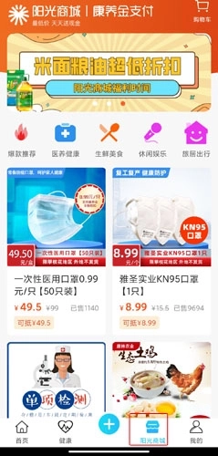 4、阳光商城页面:在这里能够选购各类健康养生相关的商品与服务,涵盖健康饮食类产品、健康用品以及健康服务等多个方面。