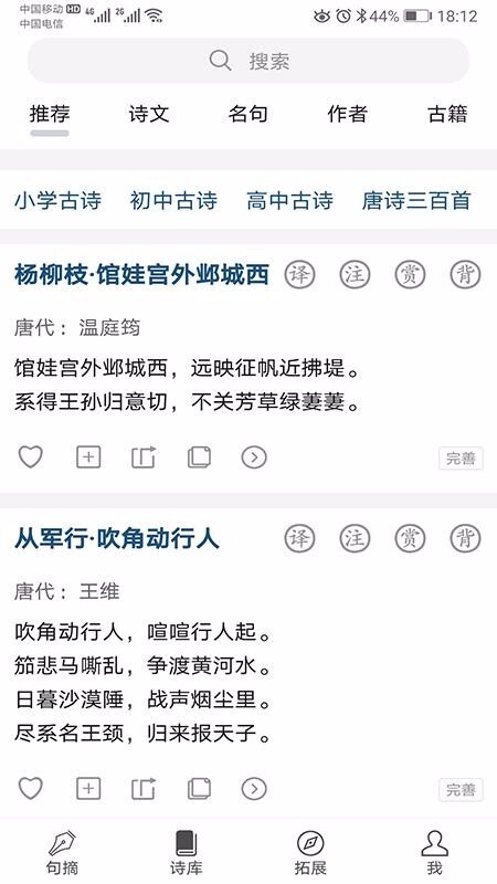 诗词秀是一款专注于诗词学习的应用,小学、初中、高中阶段的古诗以及《唐诗三百首》等丰富资源,全面覆盖孩子的诗词学习需求。平台上每首诗词都配备专业的译文、详尽的注释、深度的赏析以及便捷的背诵功能,助力用户轻松高效地掌握诗词知识。用户还能在学习过程中随时记录笔记,便捷留存重点内容,灵活满足个性化学习需求。此外,应用设有优质的句摘、诗库和扩展三大模块,为诗词爱好者提供多元学习体验。喜爱诗词的朋友,不妨下载诗词秀体验一番。