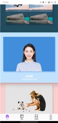 证件照相机,配备多种证件照尺寸选项,支持自动抠图与底色修改功能,还能提供精美的男女正装模板及美颜效果。
