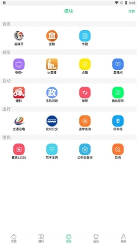 4、在“发现”板块中,同样可以看到资讯、视听、互动、出行等软件模块。