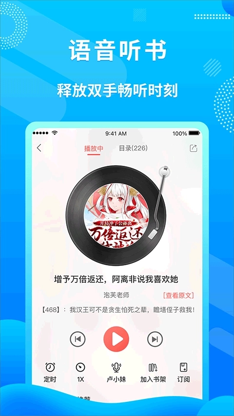 3.支持一键听书,自定义听书内容,闭上眼睛,用心感受书,轻松解放双手。